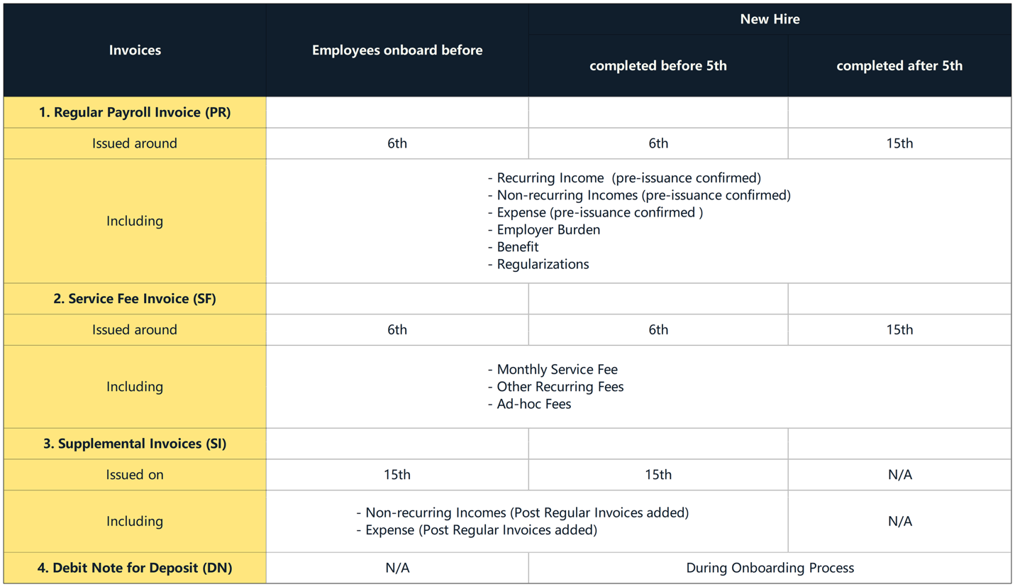 因此,北美地区员工的常规发票(包括薪资和服务费用)将于每月15日左右发送至客户提供的指定账单联系邮箱地址。
