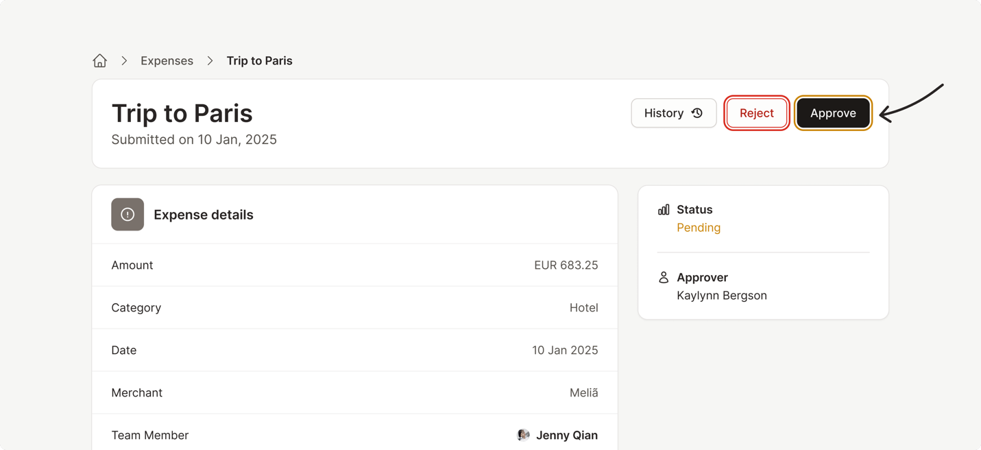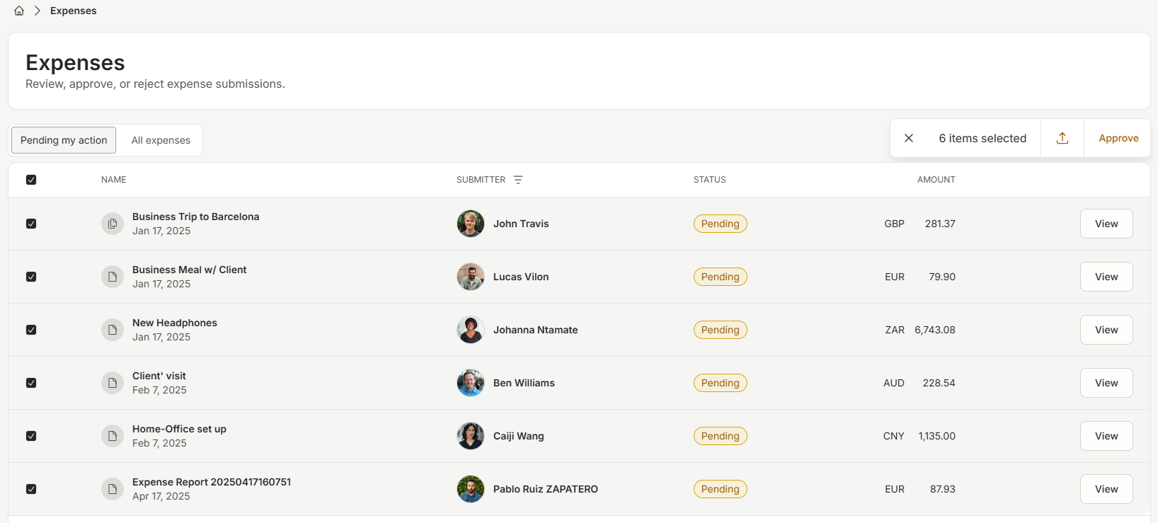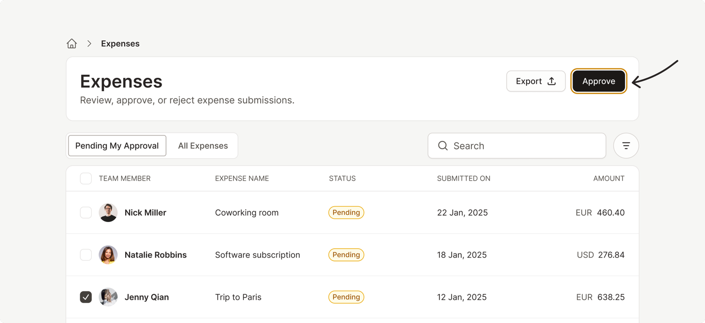 • 快速审批:员工的直属经理负责审核、批准或拒绝提交的费用。