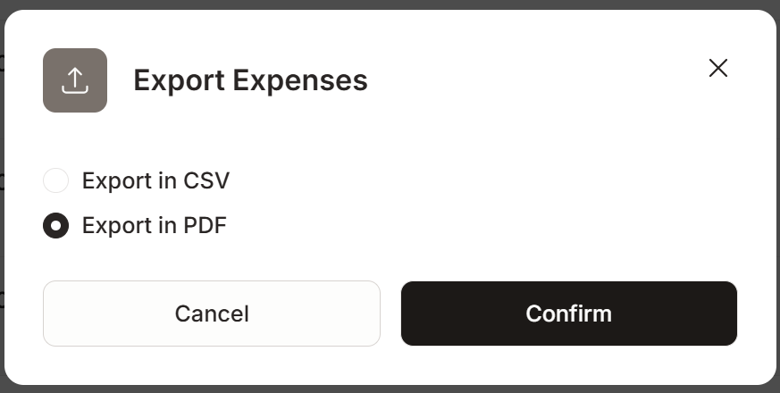 导出时,您可以选择以PDF或CSV格式导出。若选择PDF格式,每个费用报告将被保存为压缩文件中的独立PDF文件;若选择CSV格式,所选费用报告将被保存为包含基本信息的CSV文件。