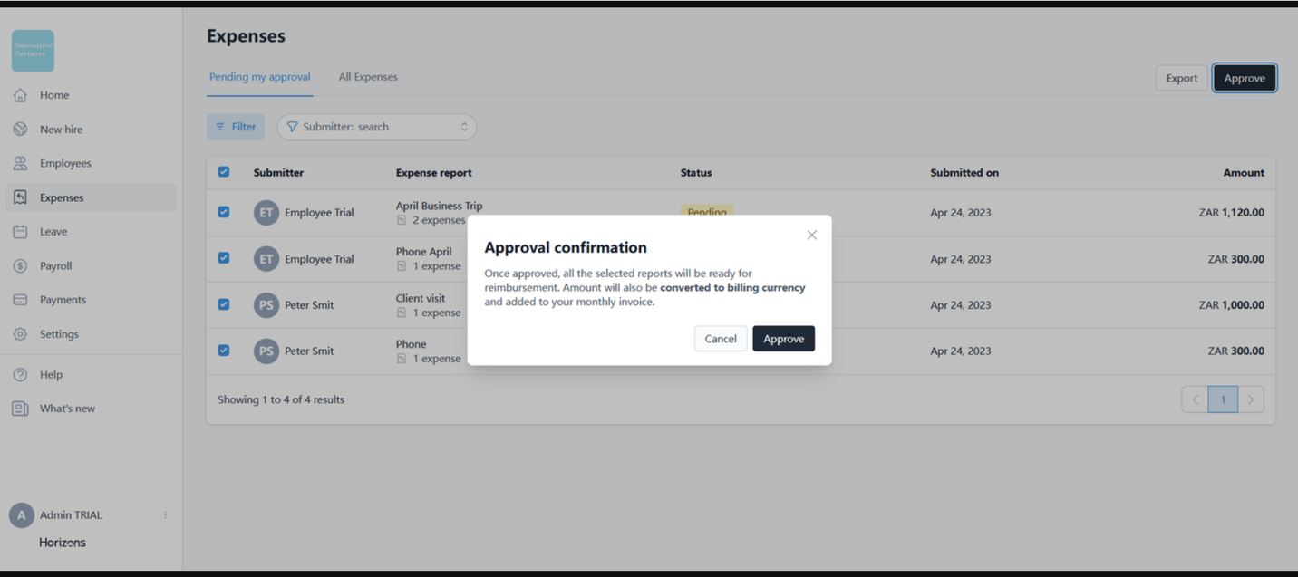 是的,Horizons 平台允许管理员通过单次点击批量审批多份费用报销单。只需选择需要审批的报销单,然后点击页面顶部的 “Approve” 按钮即可完成批量审批。