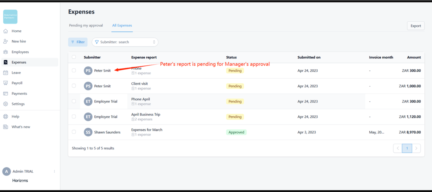 登录后,点击“Expense” 以查看所有待处理的费用报销申请。您将看到待您审核的报销申请列表。