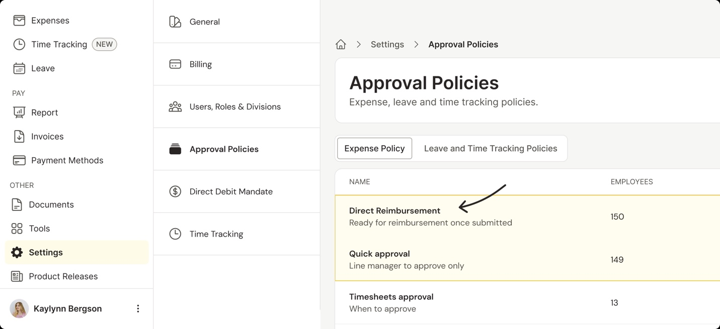 首先,请打开侧边栏,点击‘Settings’,然后从子菜单中选择“Approval Policies”。