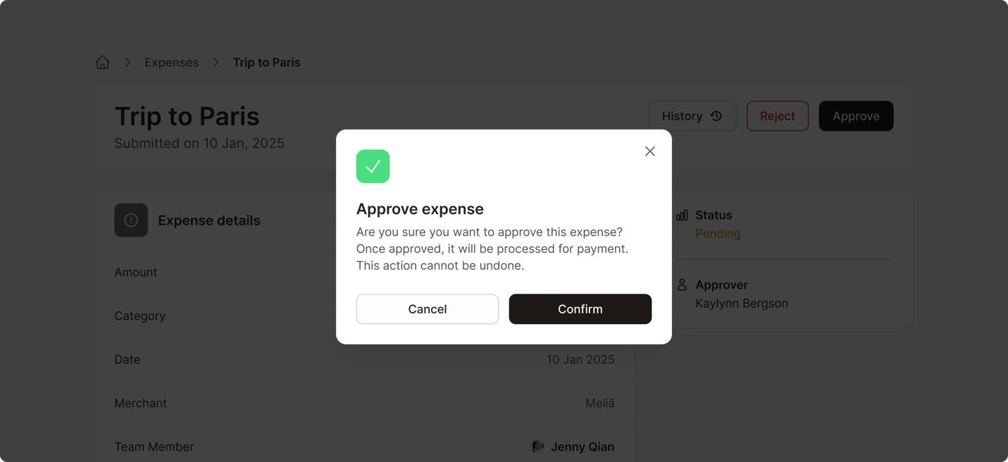 • 批准:如果所有细节均符合您的标准且一切正常,只需点击“Approve”并确认您的决定。