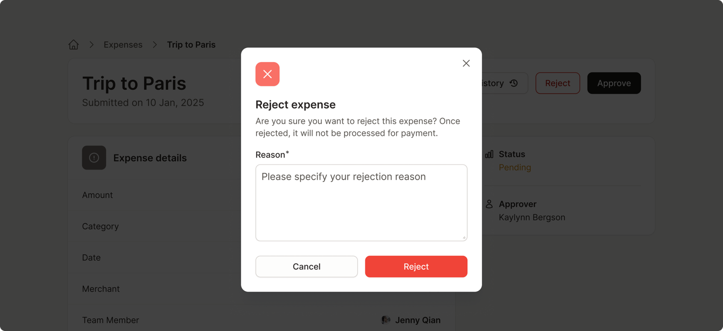 • 快速审批:员工的直属经理负责审核、批准或拒绝提交的费用。