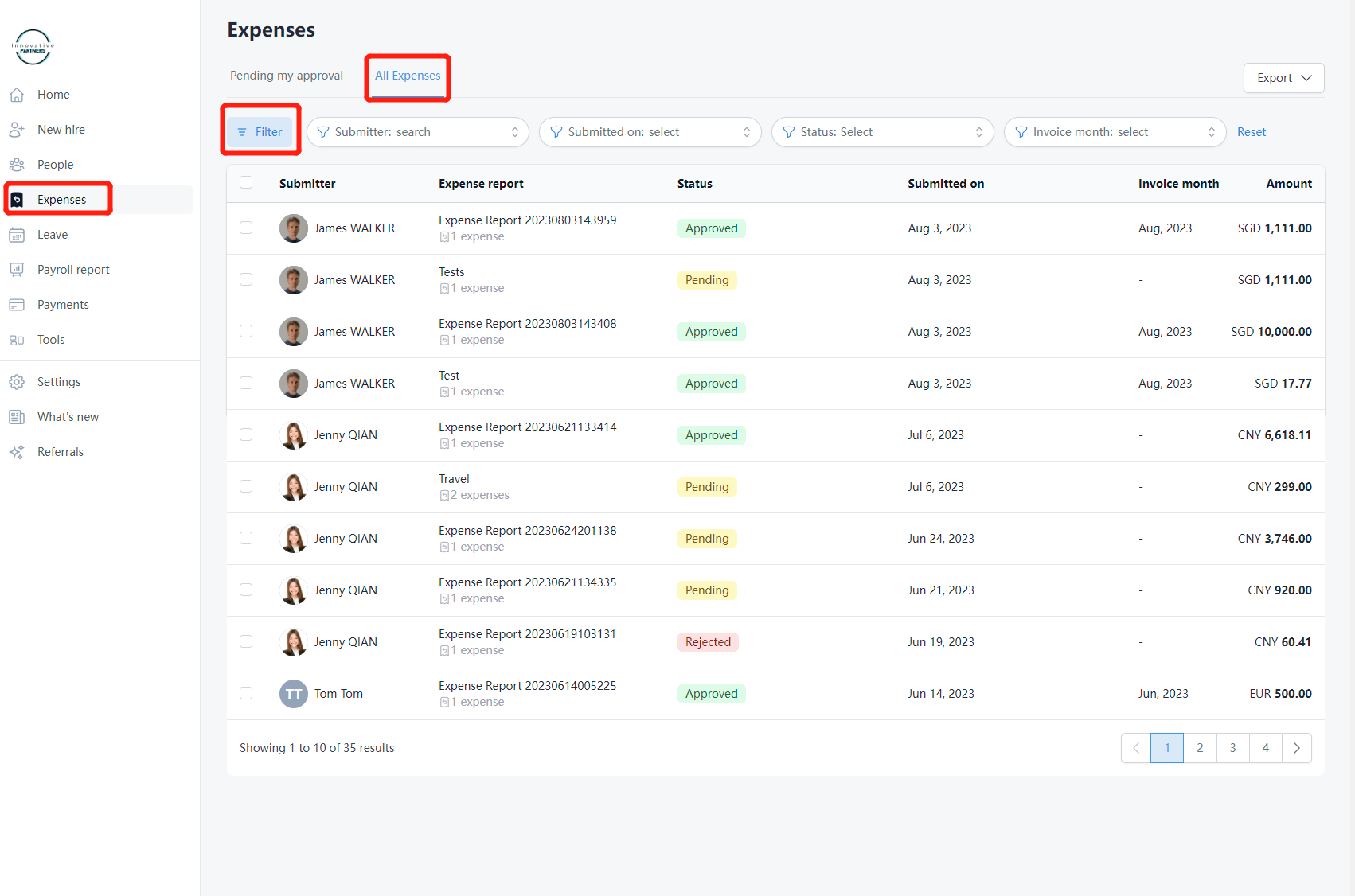 您可以在“All Expenses”选项卡中查看所有历史费用报告。为了更方便地查找特定报告,您可以根据各种条件进行过滤,包括: