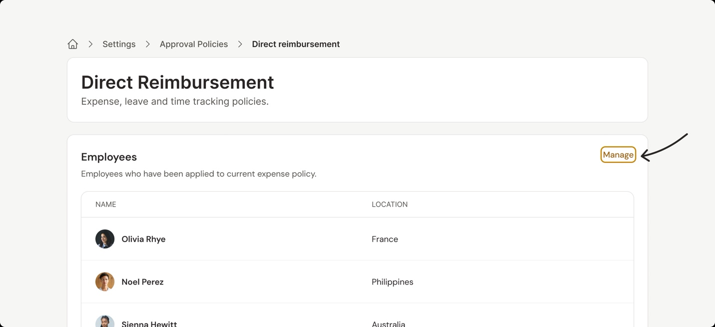 要查看或修改现有政策,请点击政策名称旁边的“View”链接。从那里,您可以点击“Manage”进行更改。要将政策分配给特定员工,只需勾选其姓名旁边的复选框并点击“Save”。