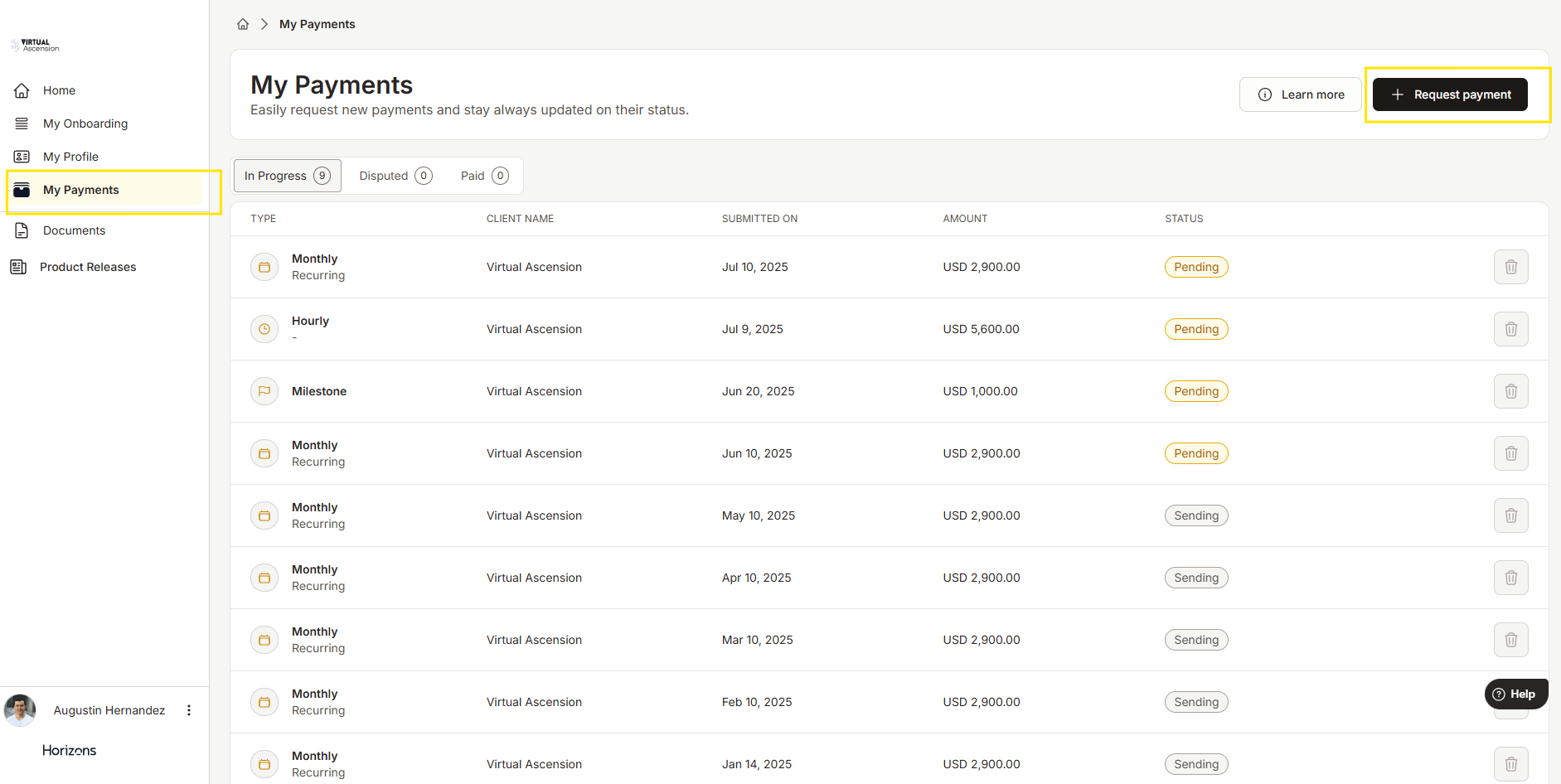 从左侧菜单中点击“My Payments”,然后在右上角选择“Request payment”。