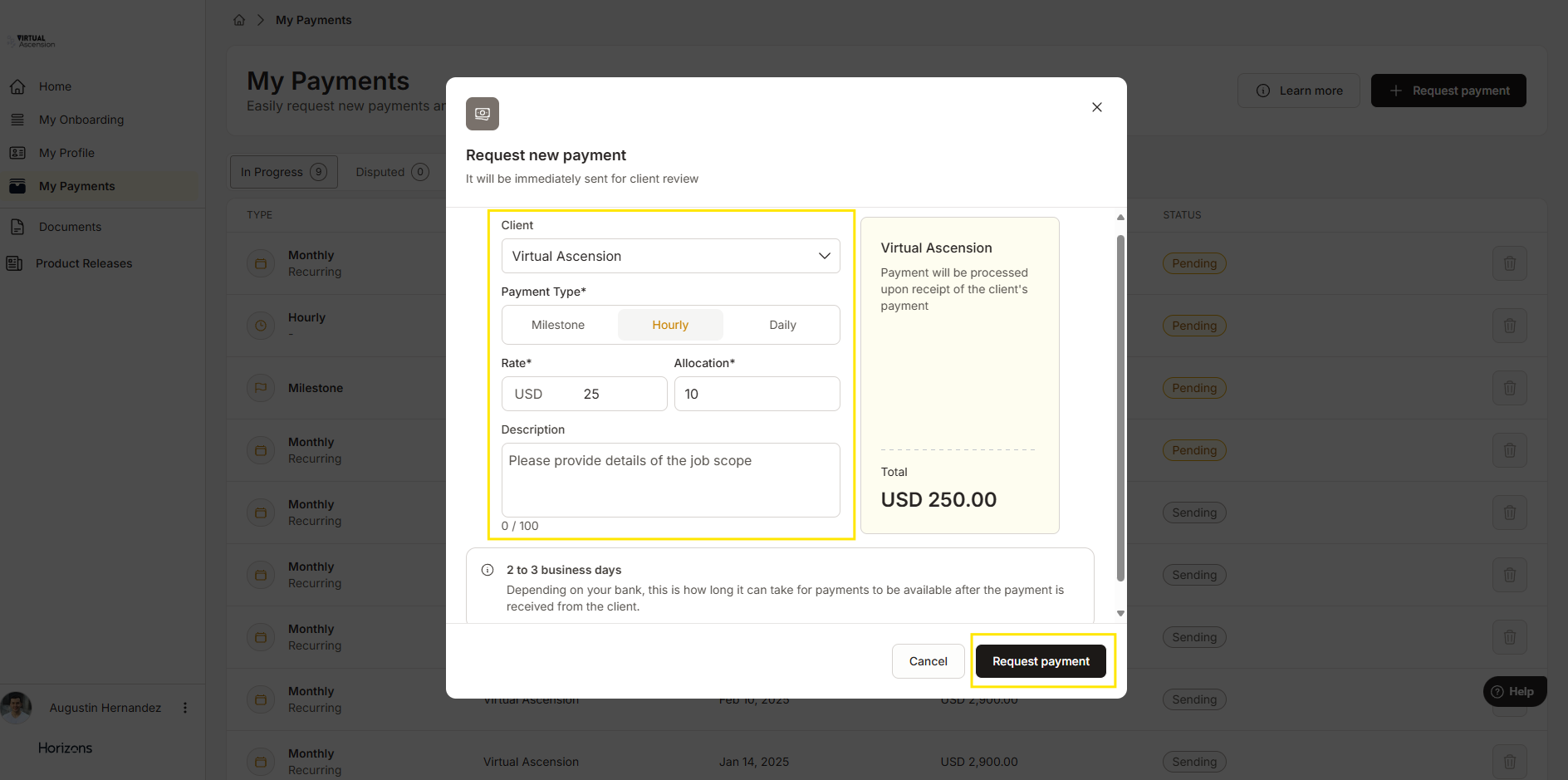 通过Horizons平台工作的承包商可以轻松地直接从平台请求一次性付款。该功能支持多种付款类型,包括里程碑付款、按小时付款或按日付款,并为您提供一种简便的方式来跟踪工作进度并向客户请求付款。