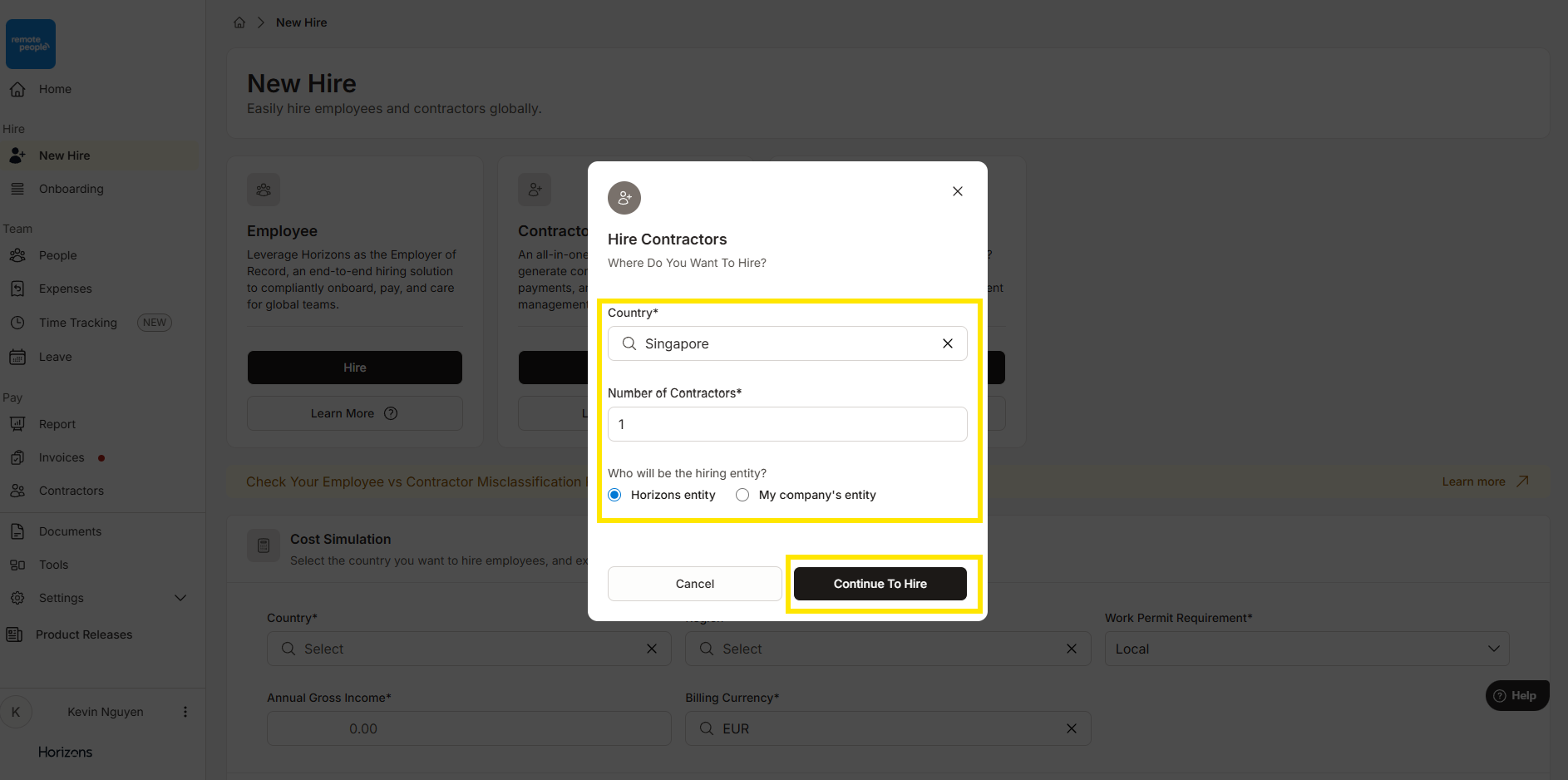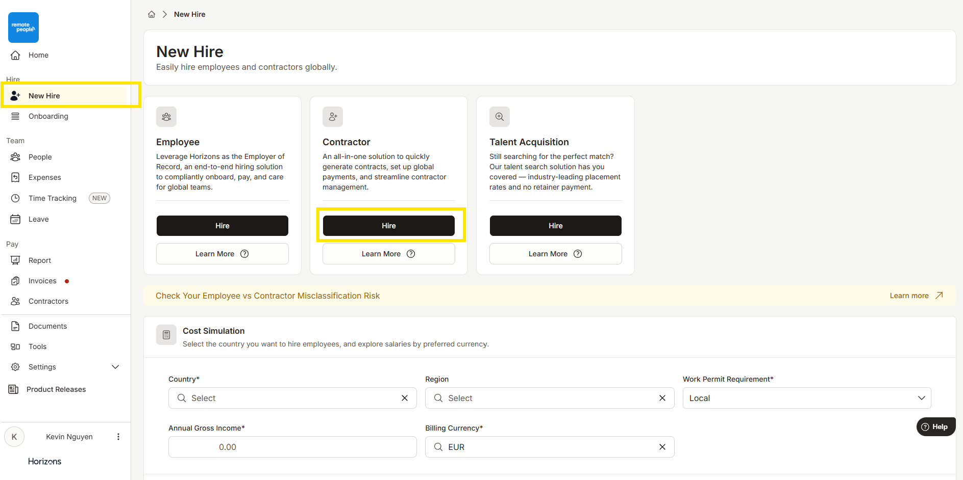 进入Horizons平台的“New Hire”标签页,在“Contractor”选项下选择“Hire”。