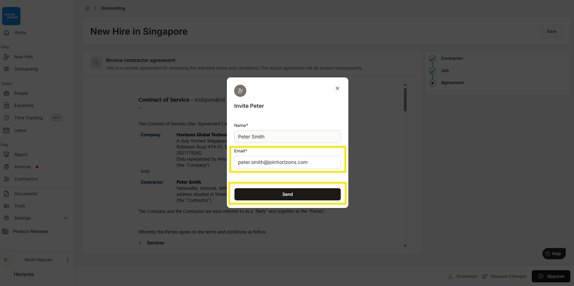 一旦承包商协议获得您的批准,您将被要求提供承包商的电子邮件地址,并通过点击“Send”邀请承包商加入Horizons平台。