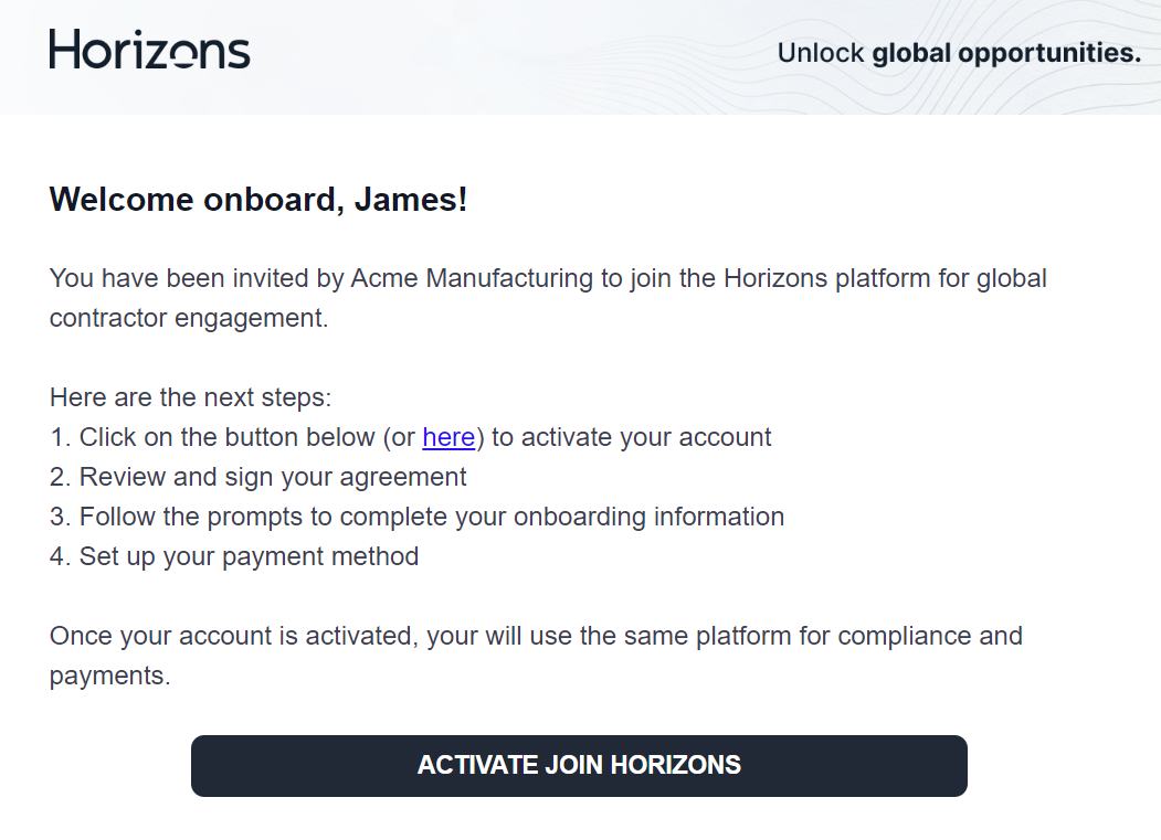 这标志着承包商入职流程已完成,您的承包商现已准备就绪,可立即开始工作,且所有付款均可通过Horizons平台直接管理。