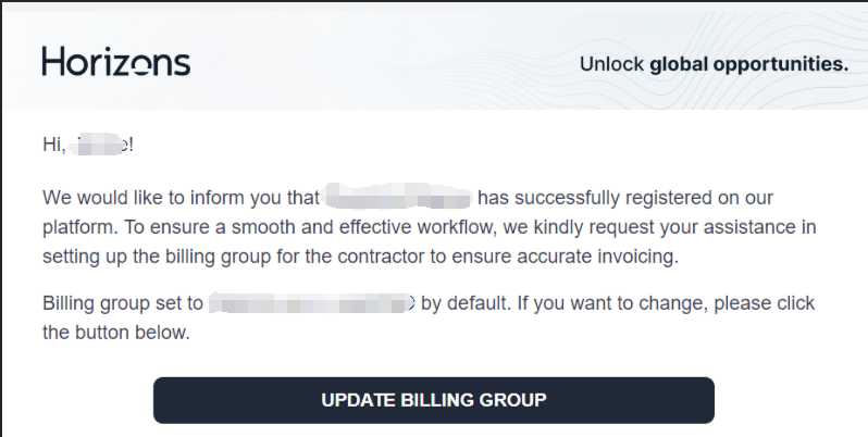 “Action Needed: Set Billing Group for Contractor” /“需操作:为承包商设置计费组”请按照邮件中的指示为承包商分配适当的计费组,或查阅本文档了解计费组的含义:什么是计费组? What is Billing Group referring to? : Horizons Help Center (joinhorizons.com)