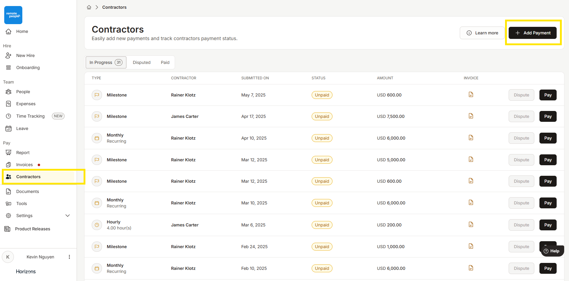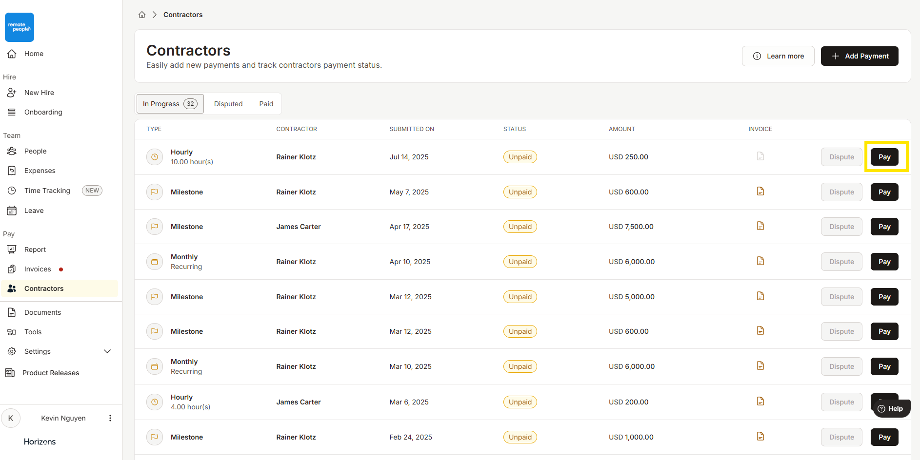 在 Horizons,客户可以通过我们的平台快速、轻松地为承包商支付一次性账单。此功能支持里程碑式、小时制或每日支付类型,让您在保持完全透明的同时灵活管理支付。