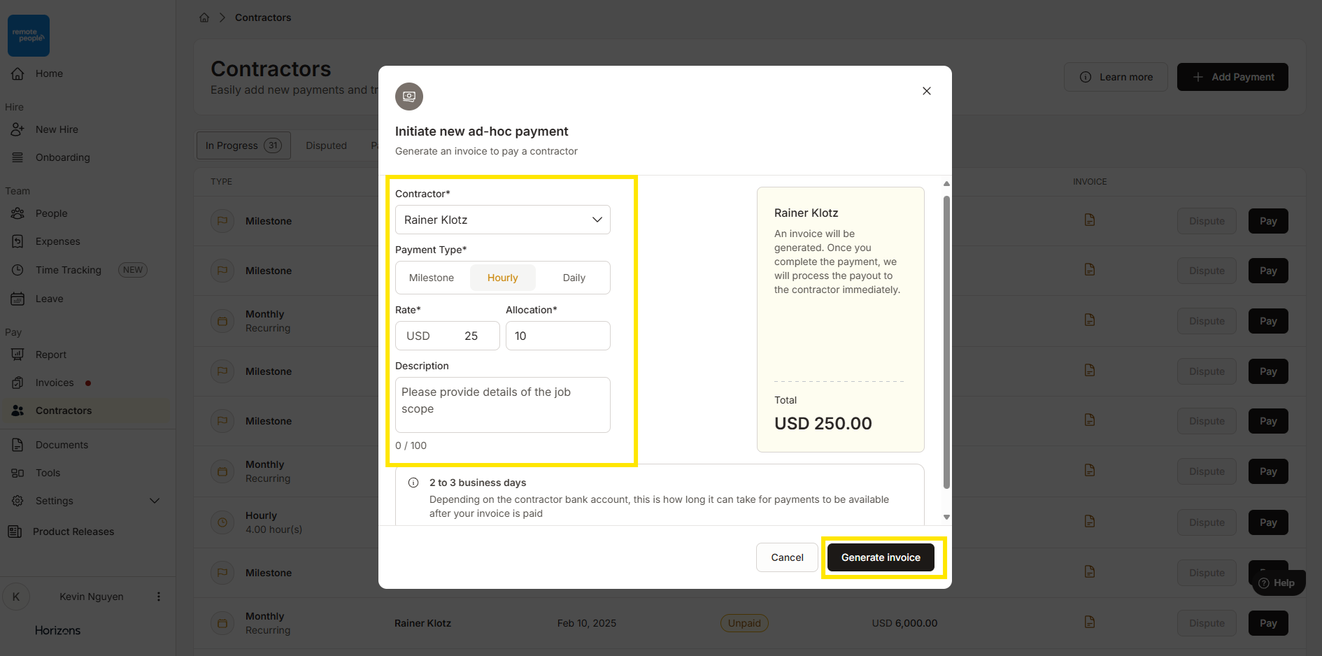 对于其他所有付款方式(包括按小时、按天或按里程碑计费),付款必须手动触发。客户或承包商均可在Horizons平台上开具一次性发票。这些额外发票将在付款前通过安全且可追溯的流程进行审核和批准。