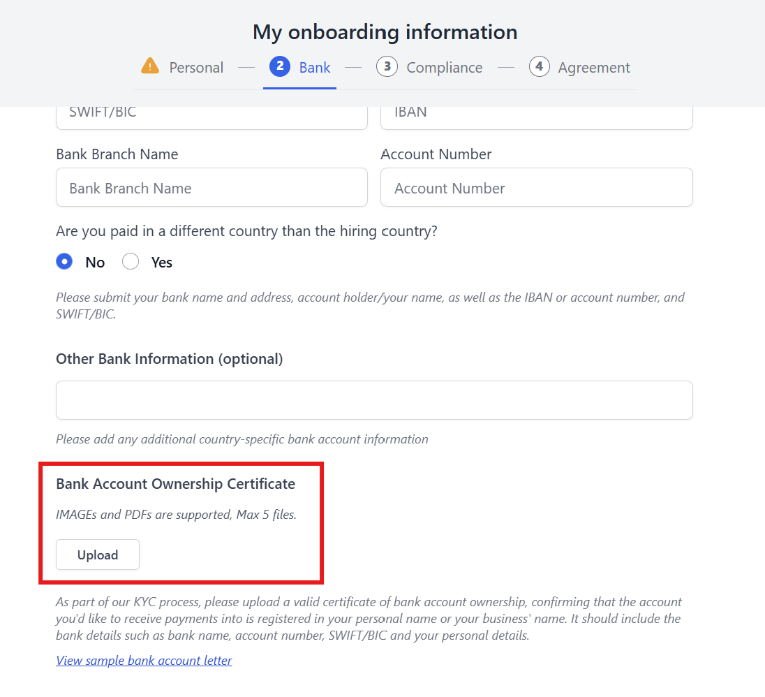 作为承包商进行入职时,您需要提供银行账户所有权证明。