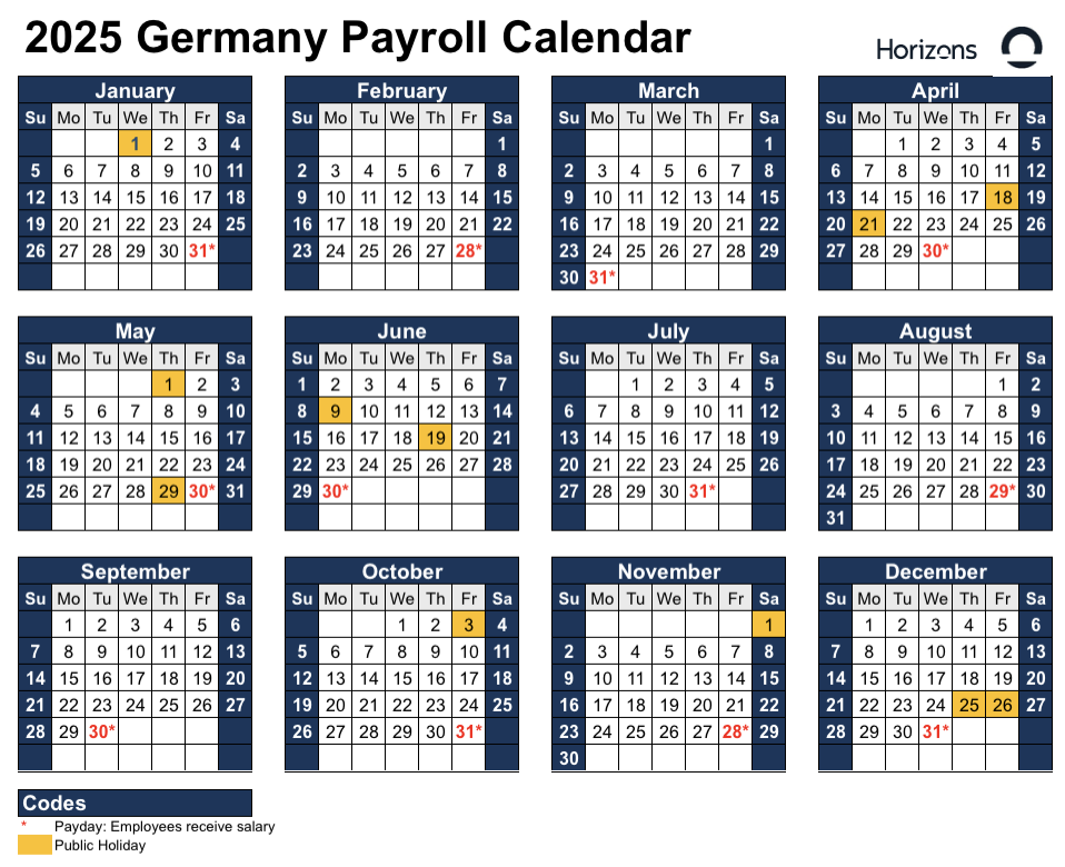 在德国,最常见的工资发放方式是按月发放,大多数员工在月底领取工资。具体来说,许多员工会在每月的最后一个工作日领取工资。这种做法在各个行业和规模的公司中都很普遍,成为大多数在德国工作的员工的标准期望。Horizons 遵循各国最佳实践和最常见的支付节奏,员工每月在月底(最迟在每月最后一天)领取工资。