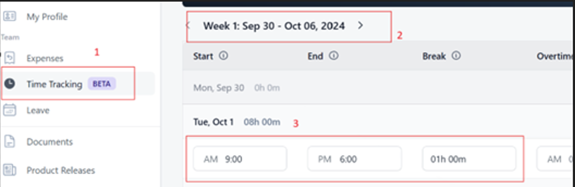 员工可以通过选择合适的周或月(第2点)并输入开始和结束时间来管理工作时间。此功能还允许员工跟踪休息时间等(第3点)。