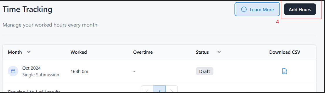 员工记录完工作时间后,可以点击屏幕右上角的 “添加工作时间”按钮提交(第 4 点)。