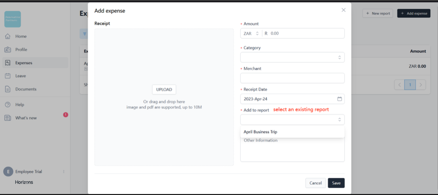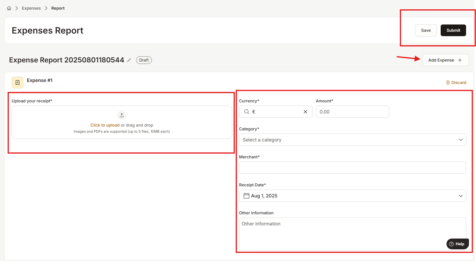 填写您的费用详情,确保从下拉菜单中选择正确的货币和类别,并上传收据。