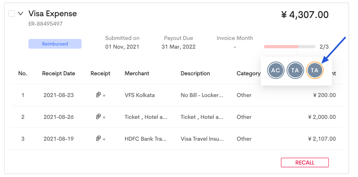 点击进入平台并选择“Expenses”。在“My Expenses”下,您可以查看审批人列表。请查看此列表以确定当前的审批人。如有必要,请直接联系当前的审批人,询问费用报销请求的状态。