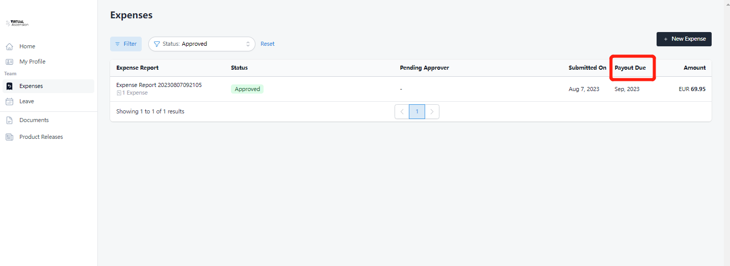 在此详细视图中,应包含有关您的费用报告状态以及与其处理和支付相关的任何相关月份的信息,其中“Payout Due”指的是支付到期日期。