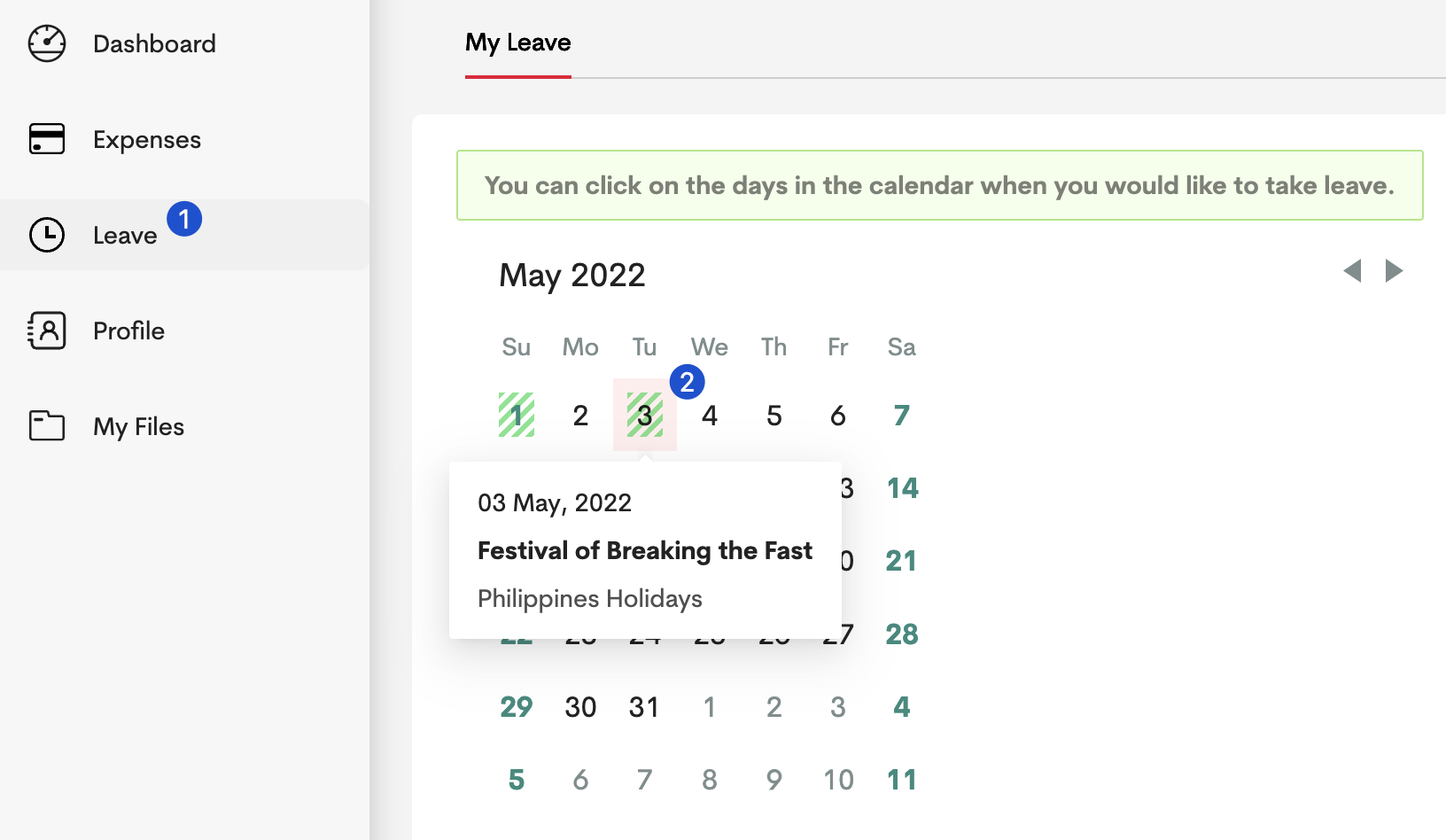 登录应用后,点击“Leave”以打开交互式日历。您可以在个人日历上看到用绿色条纹标记的公共假期。将鼠标悬停在特定日期上,即可查看该假期的详细信息。