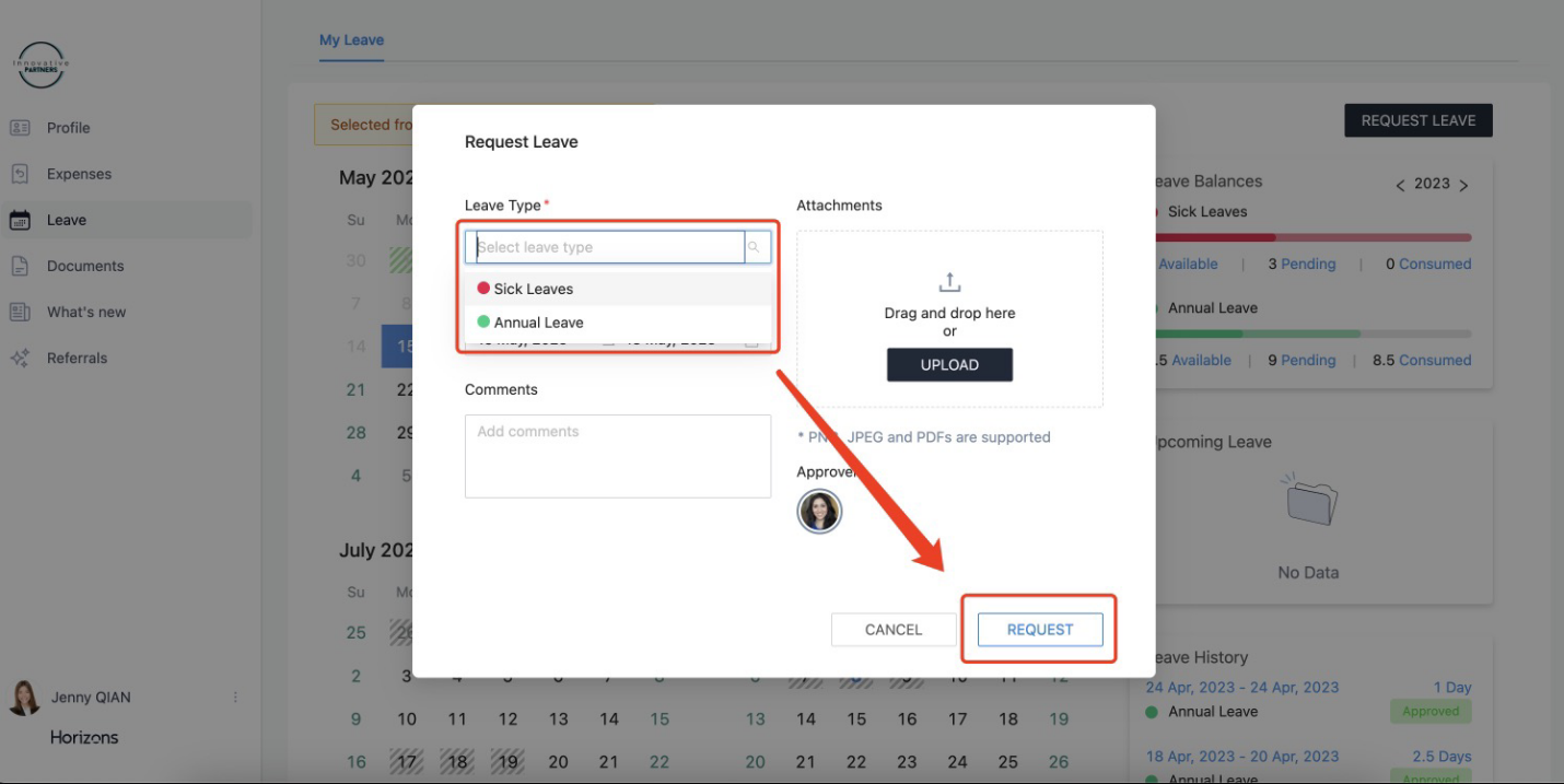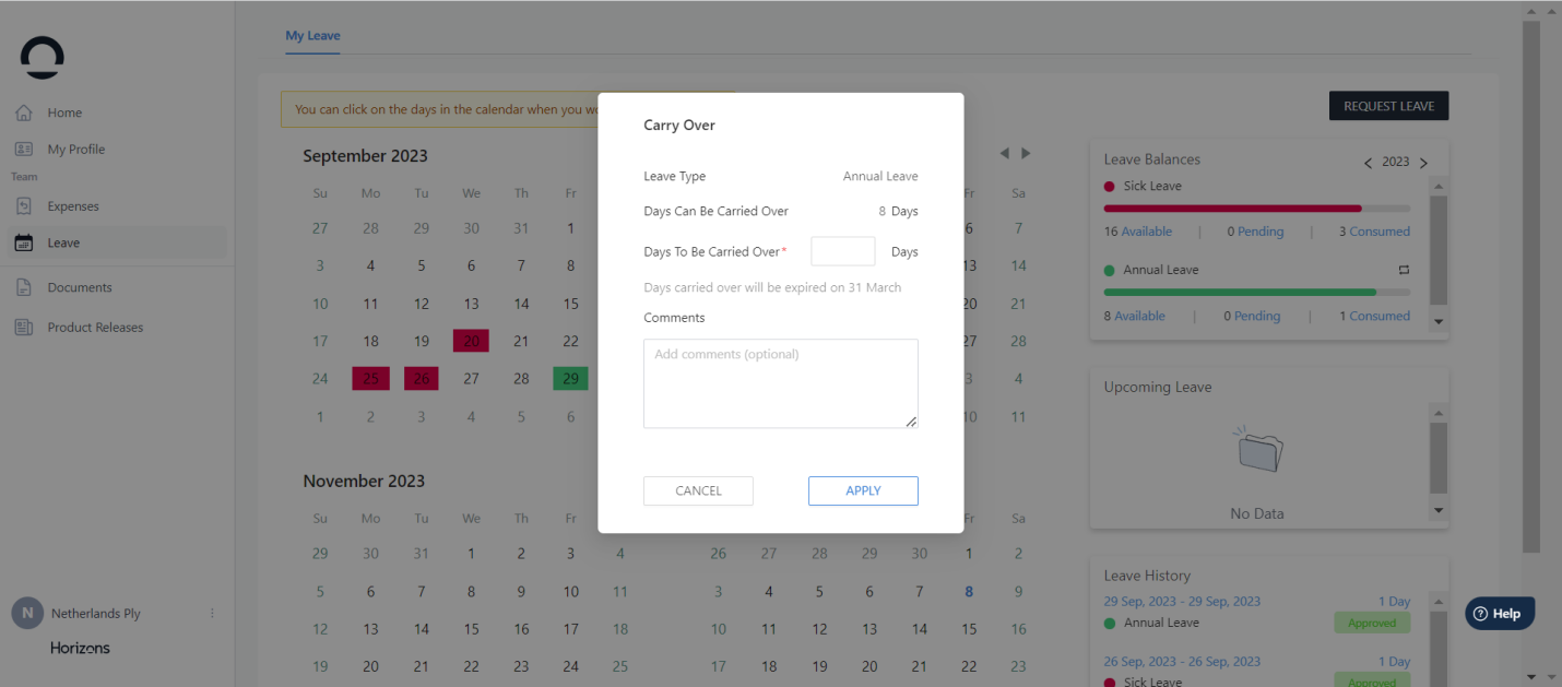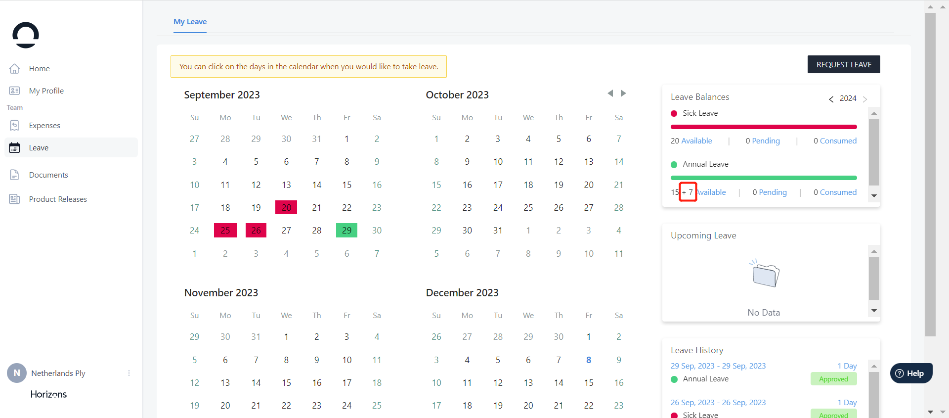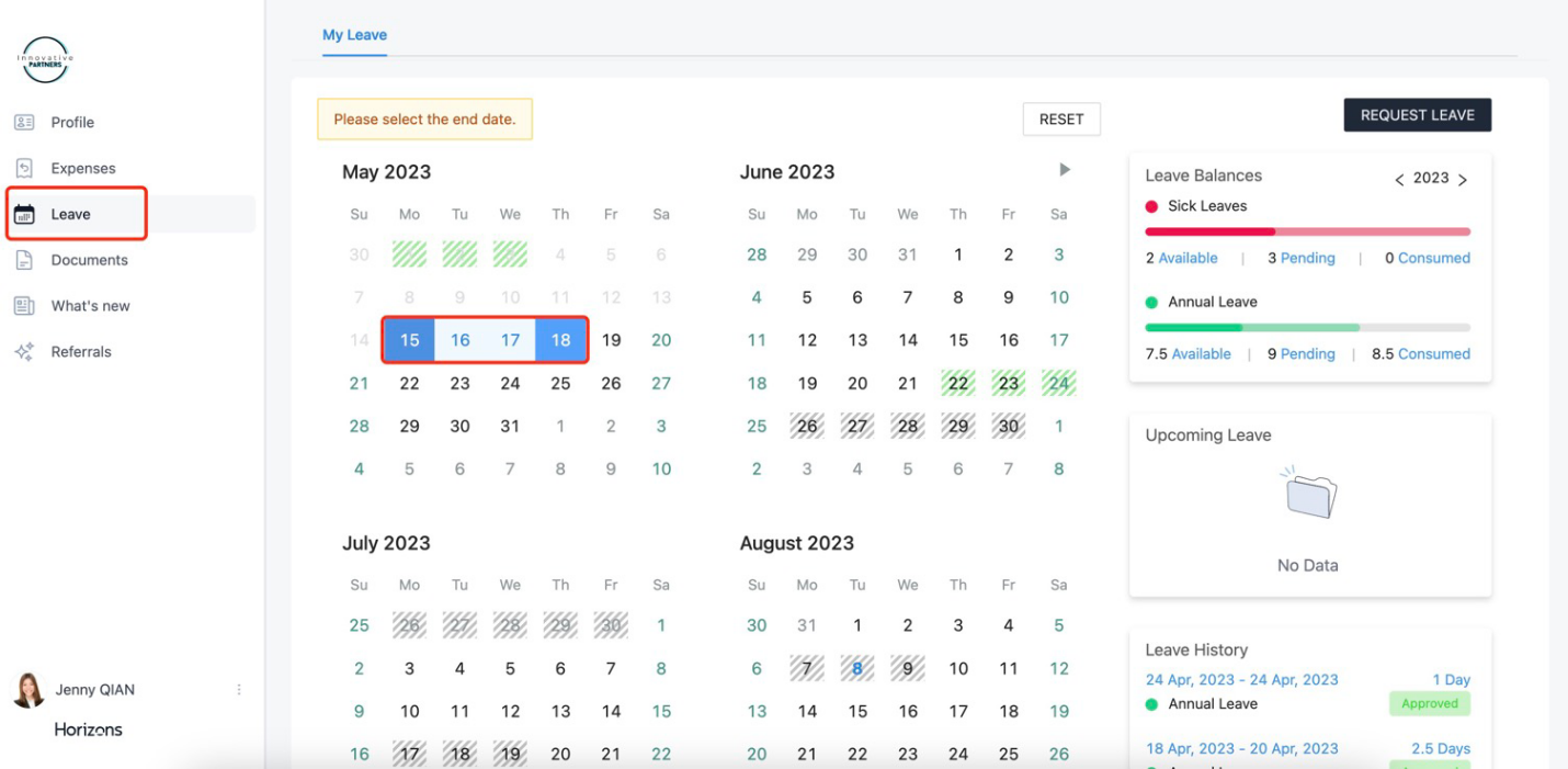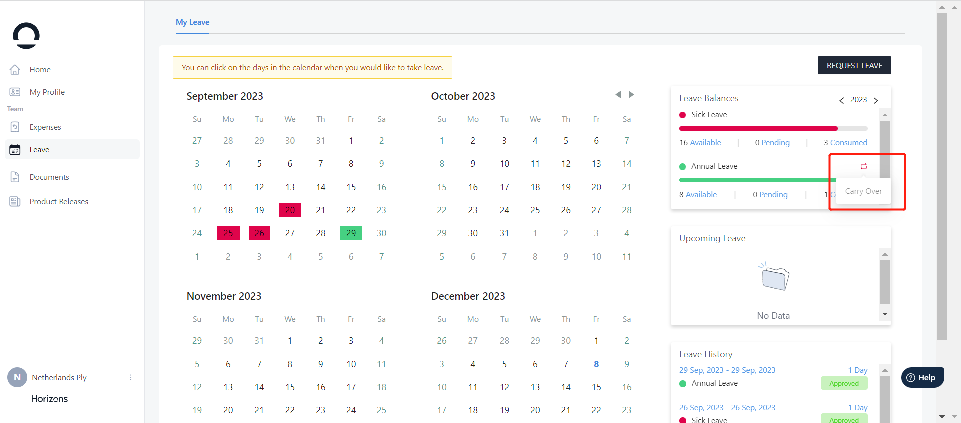 1. 在Horizons主页中,点击左侧面板中的“Leave” 选项,开始管理您的休假时间。