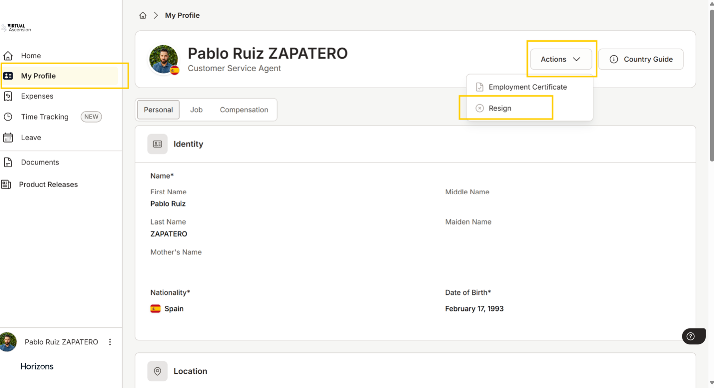 从下拉列表中点击“Resign”。这是正式通知 Horizons 您决定终止雇佣关系的途径。