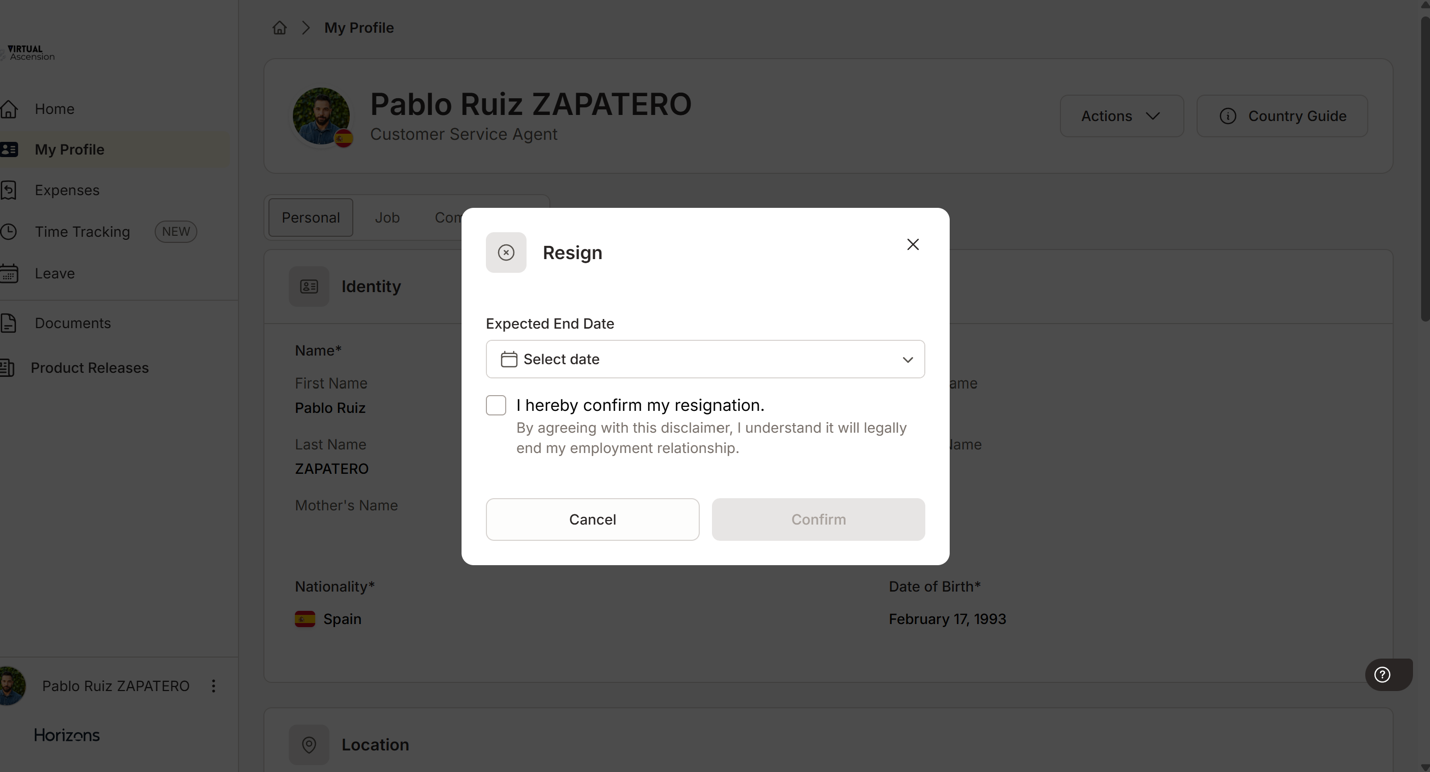 • 勾选确认复选框并点击“Confirm”以提交辞职申请。