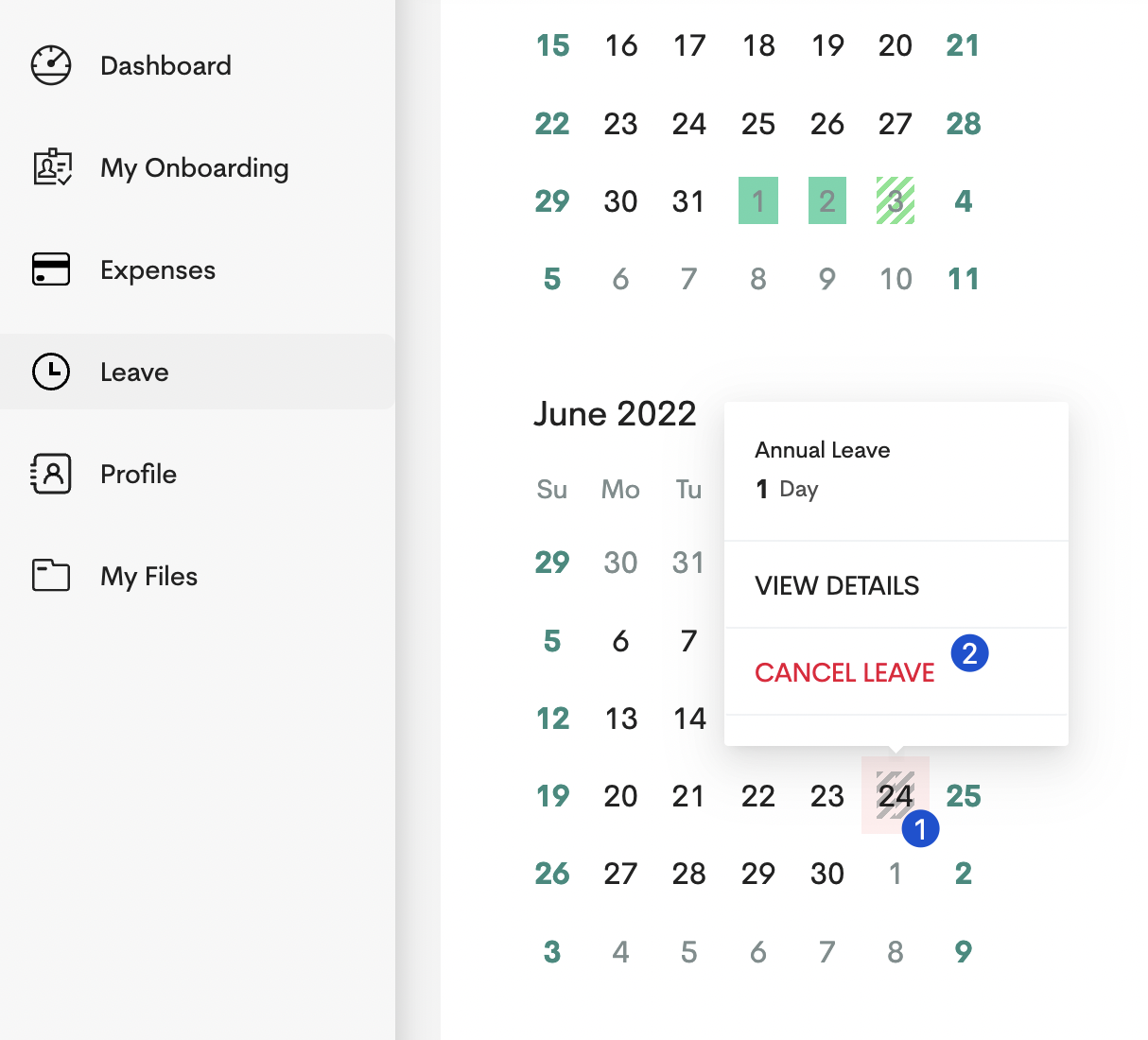 要执行此操作,请首先登录平台并选择“Leave”。这将显示您的个性化互动日历。导航至您打算撤销的请假期间,并将光标悬停在该时间段内的任何一天上。此时将出现“Cancel”选项;点击该选项并确认您的决定。