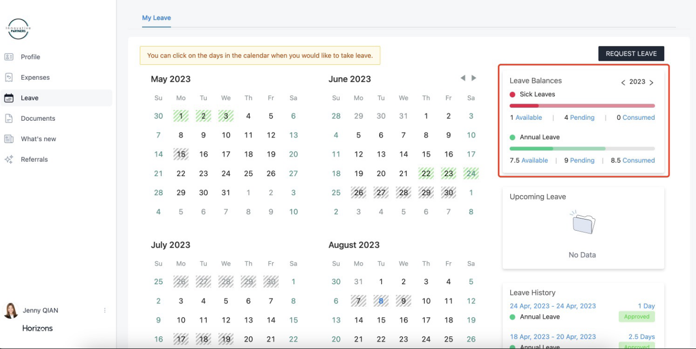 1. 转到右侧面板,查看 “LeaveBalances”部分。日历上已批准的请假天数将以绿色高亮显示。已使用的天数将自动从您的年度请假余额中扣除。